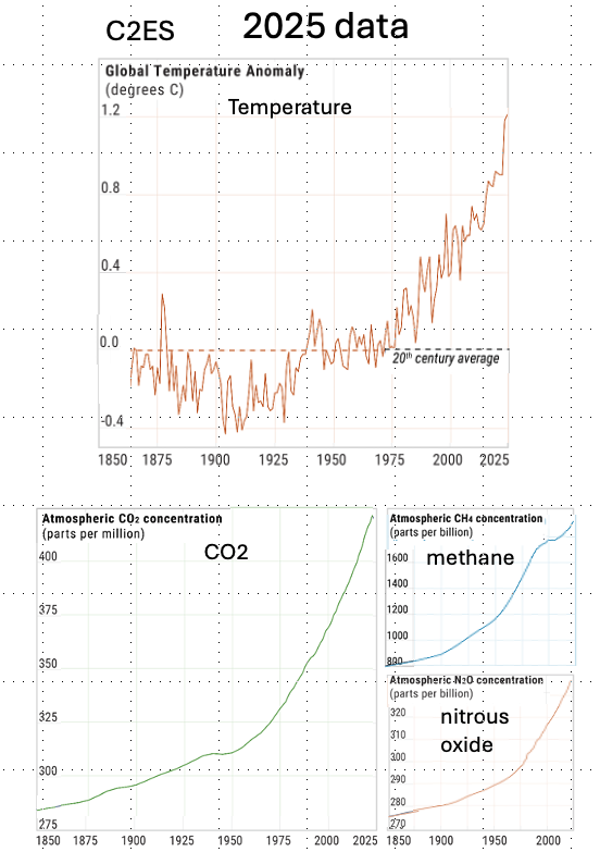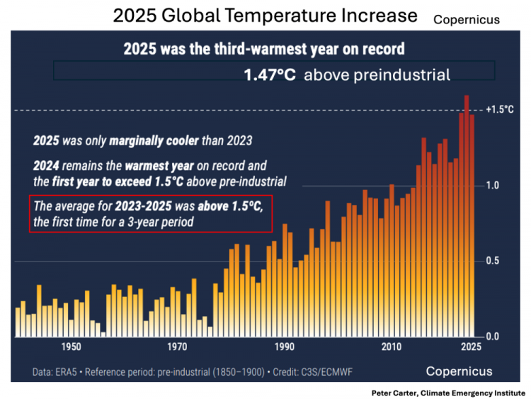 2025 Global temperature was averaged at. 1.44°C by WMO, and 1.47°C by NASA GISS and Copernicus.